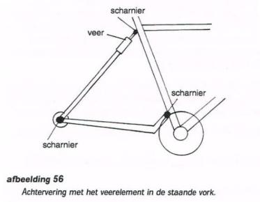 De liggende en staande achtervork zijn scharnierend met het frame en elkaar verbonden. In de staande achtervork is een veerelement geplaatst, zie afbeelding 56. Voordeel van deze constructie is dat het frame dezelfde vorm heeft als het klassieke frame. Nadeel is dat het veerelement op buiging belast wordt door zijdelingse krachten op het frame en de remkrachten (als de rem op de staande achtervork is gemonteerd).