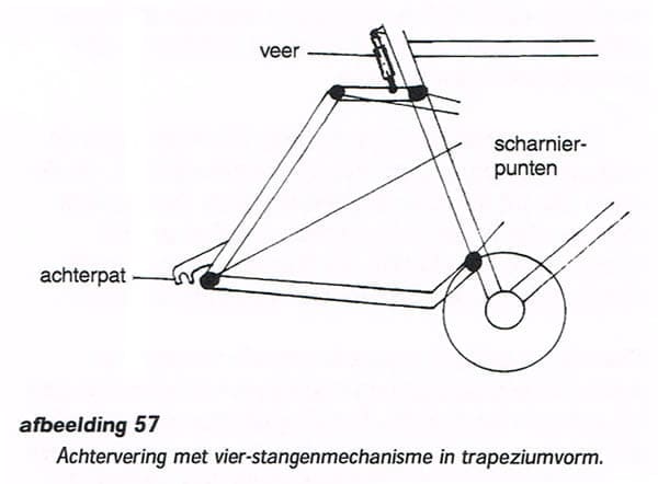 De achtervork bestaat uit vier-stangenmechanisme in de vorm van een trapezium. Voordeel is dat de invloed van de trapkrachten kleiner is. Nadeel van deze constructie zijn de vele draaipunten, zie afbeelding 57.