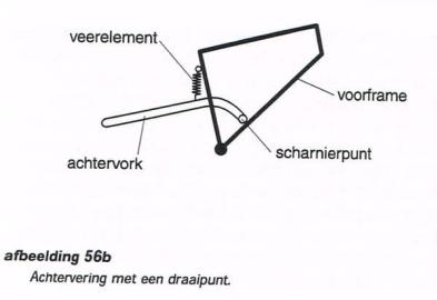 Een starre achtervork is scharnierend bevestigd aan het frame. Tussen de achtervork en frame is een veerelement bevestigd. Het scharnierpunt moet ongeveer ter hoogte liggen van het kleine kettingblad. Deze constructie heeft als voordeel dat die slechts een draaipunt heeft, zie afbeelding 56b. Nadeel is dat de achtervork op buiging belast wordt waardoor deze vrij zwaar moet worden uitgevoerd. Een ander nadeel is dat het veerelement ongeveer moet komen waar de zitbuis zich bevindt. De framevorm wordt dan ook vaak aangepast.