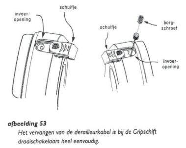 - Een stelschroef tussen het huis en de buitenkabel om de lengte van de kabel te stellen.