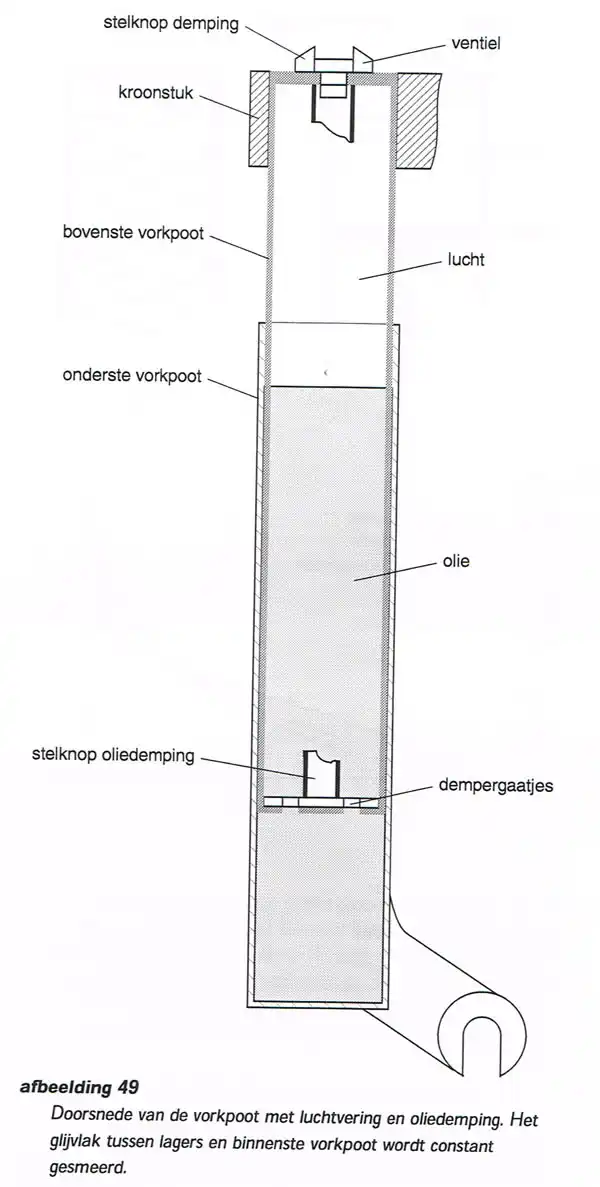 Doorsnede van de vorkpoot met luchtvering en oliedemping. Het glijvlak tussen lagers en binnenste vorkpoot wordt constant gesmeerd.