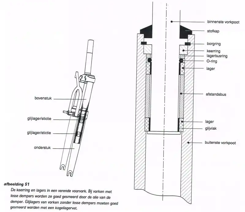 Glijlagers en keerring. Deze moeten er voor zorgen dat de binnenste vorkpoot soepel in de buitenste vorkpoot glijdt en dat de olie bij losse dempers niet uit de vorkpoot kan lekken. Boven de lagers en keerring zitten nog een borgring om te voorkomen dat je de vorkpoten uit elkaar trekt en een stofkap om binnendringen van vuil te voorkomen. De glijlagers raken zwaar belast doordat er buigkrachten op de voorvork werken. De glijlagers smeer je goed voor een goede werking., zie afbeelding 51.
