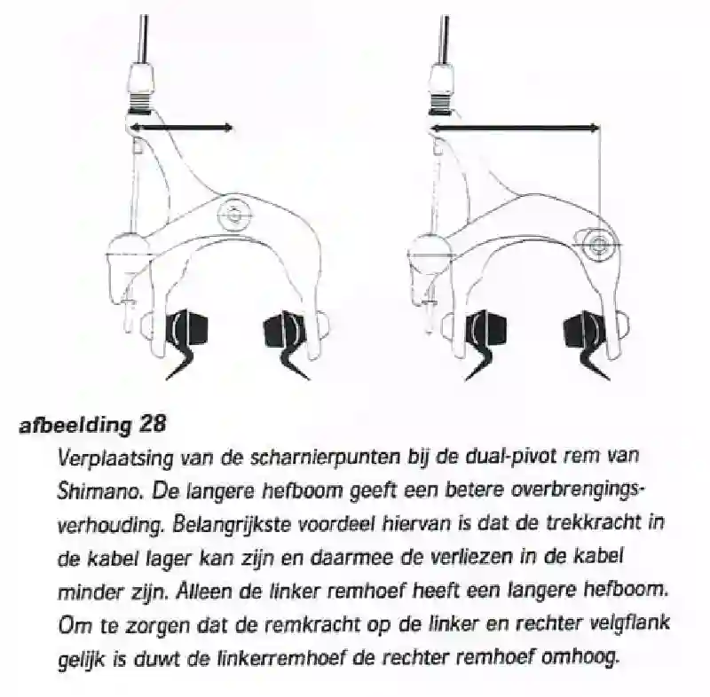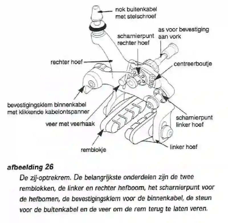 De zij-optrekrem of side-pull rem is de meest gebruikte velgrem op racefietsen. (zie afbeelding 25)