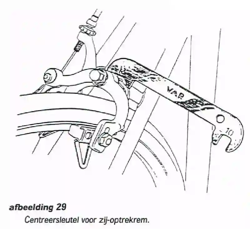 Het grootste probleem van zij-optrekremmen is het centreren van de rem. Beide remblokken moeten even ver van de velg staan om goed te kunnen remmen. Het centreren is lastig omdat je bij het aandraaien van de moer op de bevestigingsas de rem tordeert. Hoewel de rem bij het aandraaien in het midden blijft staan, kunnen er toch spanningen in de bevestiging ontstaan die ervoor zorgen dat de as verdraait zodra je de rem aantrekt. Om dit te voorkomen zet je de rem met twee sleutels vast. Eén om de moer aan te draaien en één om de rem in tegengestelde richting te draaien of vast te houden. Voor het vasthouden van de rem zijn speciale centreersleutels beschikbaar. (zie afbeelding 29).