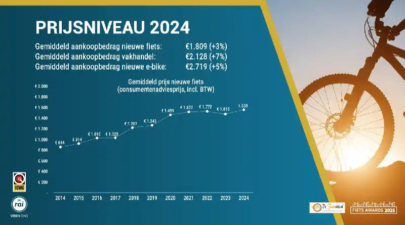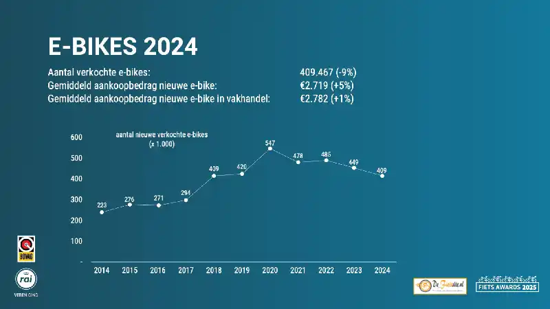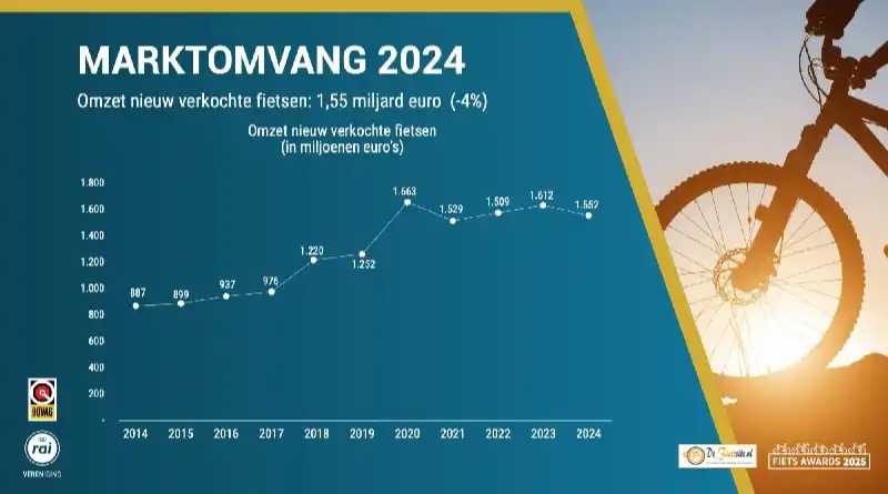 Fietsbranche blijft stabiel in 2024. E-bikes ruggengraat van de markt. De Nederlandse fietsbranche kende in 2024 een stabiel jaar, ondanks een lichte daling in verkoopaantallen. In totaal werden 858.126 nieuwe fietsen verkocht, wat een daling van 7% betekent ten opzichte van 2023. De totale omzet kwam uit op €1,55 miljard, een afname van 4%. De gemiddelde prijs per fiets steeg echter naar €1.809. E-bikes blijven de drijvende kracht achter de markt en vormen een steeds belangrijker segment. Dit blijkt uit onderzoek van de Koninklijke RAI Vereniging en BOVAG, uitgevoerd door GFK.