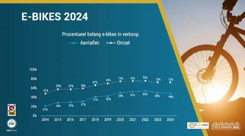 - In 2024 is dit verder gegroeid naar 48% van de verkochte fietsen en 72% van de omzet.