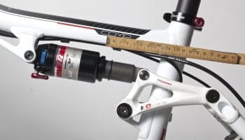 Stap dan voorzichtig af, probeer de fiets niet te laten veren. Kijk hoever de O-ring of tie-wrap verschoven is. Dit stuk noemen we de sag of inzakking, deze bedraagt 15% van de schacht lengte voor een snelle XC bike tot 35 procent voor een downhiller.