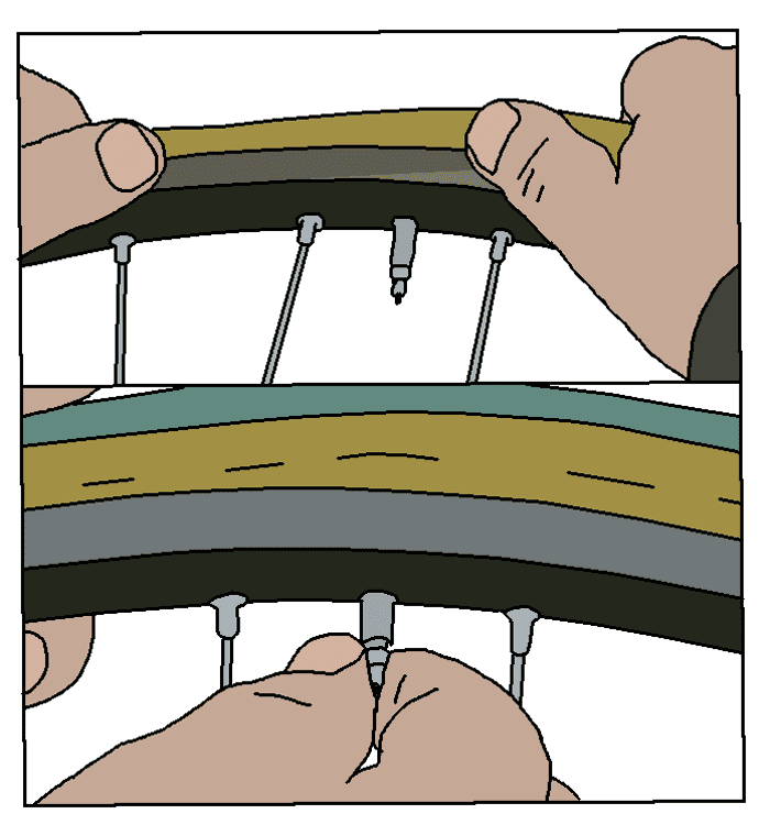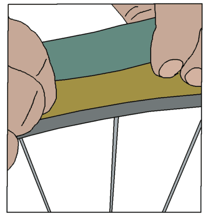 Pak de hiel van de buitenband aan beide kanten met je duimen vast en druk deze dusdanig terug dat de velg aan beide kanten netjes om de band sluit – zo voorkom je gekke bobbels.