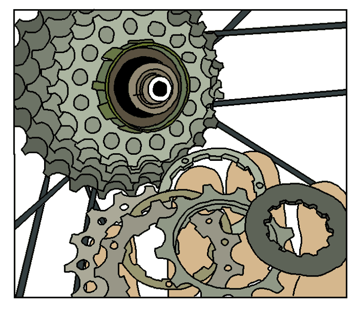 Bij de groepen Xenon, Mirage en Veloce bestaat de cassette uit losse kransen met spacers ertussen.