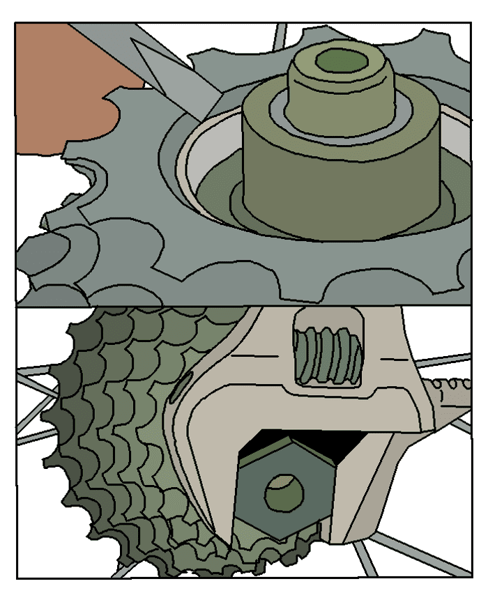 Bij de meeste 7/8-speed cassettes van Shimano zitten de 5/6 grootste kransen aan elkaar vast met kleine inbusbouten.