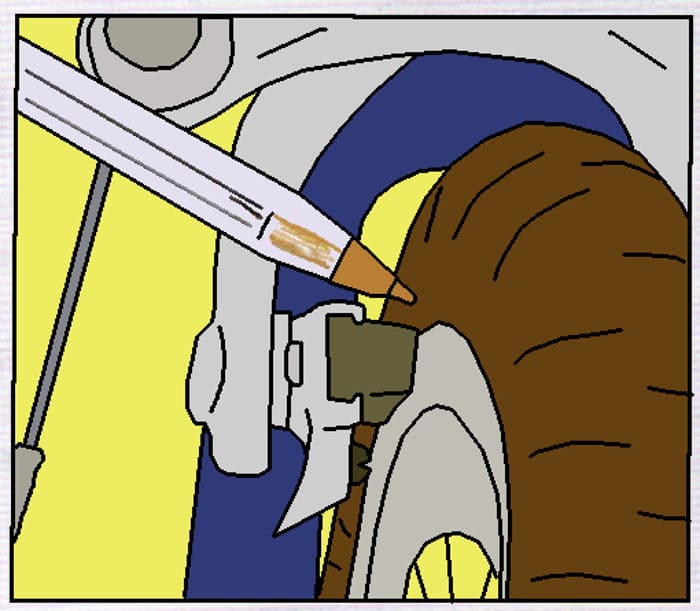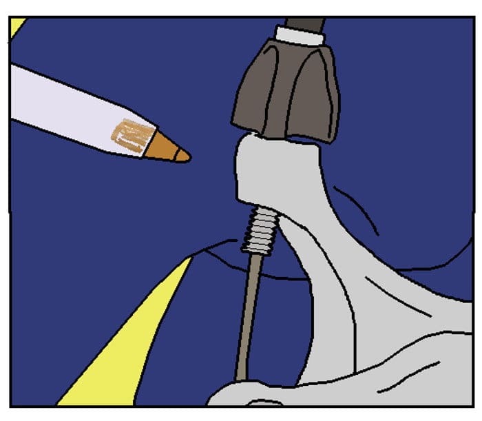 Kijk of de remarm verbogen is ter hoogte van de kabelversteller; hier verbuigt de rem vaak wanneer het voorwiel omdraait en de remarm de onderbuis raakt.