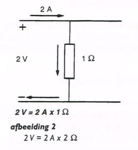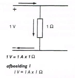 Wanneer door een geleider met een weerstand van 1 Ω een stroom loopt van 1 A, is hiervoor een spanning nodig van 1 V (afbeelding 1).